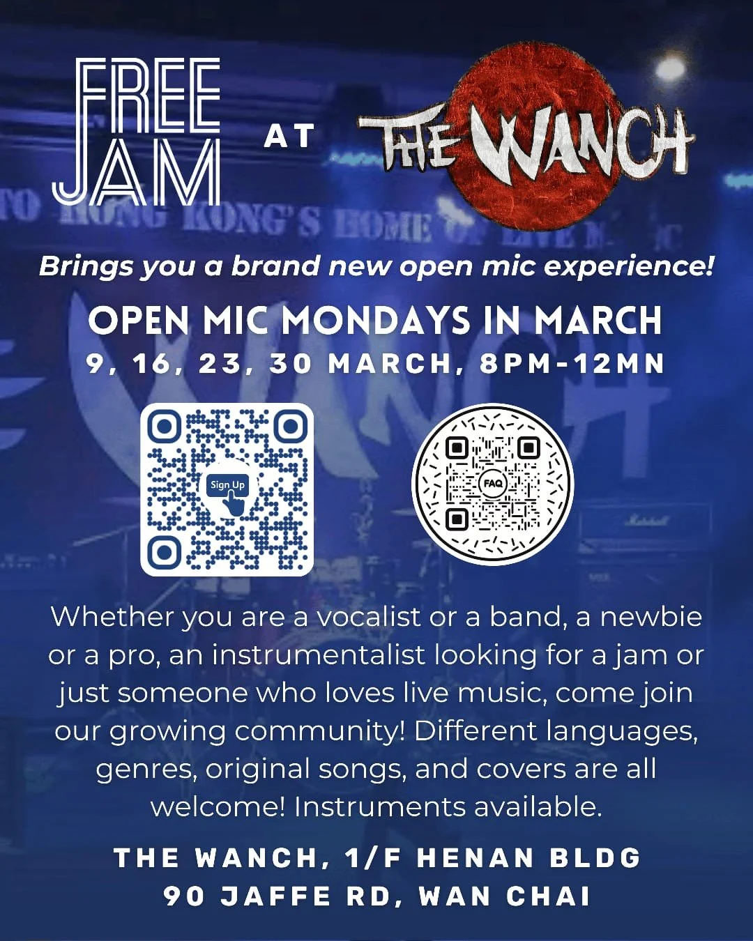 A new open mic event held at the iconic and longstanding staple of live music in Hong Kong! Soak in the amazing space and stage in the heart of Wan Chai. All comers and genres welcome. We’ll have the full band setup of an acoustic guitar, an electric guitar, a bass, a keyboard, and drums. Perform as a band or ask other musicians at the event to help out on the various instruments!